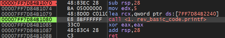 지역변수인 a를 출력하는 코드를 x64dbg로 동적 분석