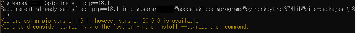 위 방법으로 설치를 할 때 오류가 생긴다면 pip 버전을 밑사진과 같이 다운그레이드를 진행해야 함